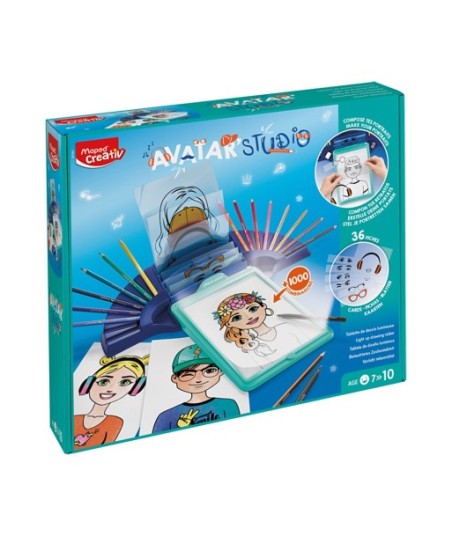 Liberte o seu artista interior e mergulhe no excitante reino da criação digital com o Maped Creativ Avatar Studio. ¶¶Concebida para capacitar artistas, animadores e entusiastas digitais de todas as idades, esta ferramenta versátil e fácil de utilizar dá vida às suas visões criativas mais loucas como nunca antes.¶¶A máquina de desenho Avatar Studio é muito fácil de utilizar. ¶As crianças escolhem os elementos que irão compor o seu retrato entre os 36 cartões laminados. ¶Colocam-nos na máquina de desenho luminosa para criar o seu retrato. ¶Uma folha de plástico transparente mantém tudo unido. ¶Depois, basta colocar uma folha de papel branco (formato A5) no ecrã, ligar a luz da máquina e desenhar! ¶¶Está pronto a criar muitos avatares de retrato divertidos e únicos.¶¶O conjunto inclui:¶Máquina de luz¶36 cartões de plástico com modelos para transferir¶14 lápis de cor sem madeira Color'Peps Strong¶5 folhas A4 em branco¶Lápis de grafite Black'Peps¶Caneta de feltro fina Graph'Peps (0,4 mm preta)¶Caneta de feltro Color'Peps Ocean (preta)¶¶Idade recomendada: + 7 anos