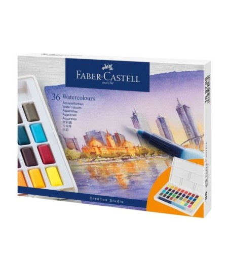 Faber-Castell para iniciantes e artistas de hobby, um pincel de água e uma paleta de mistura destacável. ¶Todas as técnicas convencionais de aquarela podem ser implementadas com aquarelas altamente pigmentadas. ¶¶O pincel de água fornecido, que pode produzir inúmeros e fantásticos efeitos, é o companheiro perfeito para pintar ao ar livre ou em viagens. ¶As cores brilhantes, incluindo cores metálicas e neon, impressionam pois dão alegria e expressão à sua própria criatividade.¶¶Caixa com 36 Cores Sortidas ¶Cores brilhantes, completamente solúvel em água¶Com pincel de água e paleta destacável¶Mistura perfeita de tons claros e escuros¶Pigmentos de alta qualidade¶