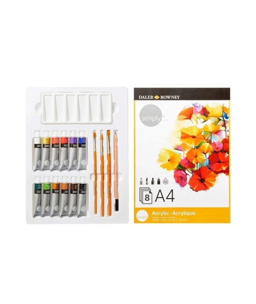 Fabricados em Inglaterra desde 1783, Daler-Rowney continua a inspirar artistas em todo o mundo.¶Produtos exclusivos em todos os canais e categorias de produtos pertencentes às artes plásticas, com linhas de produtos personalizadas para artistas profissionais e amadores, bem como estudantes e iniciantes. ¶¶Simply Acrylics são cores acessíveis que podem ser usadas para pintar em todas as superfícies de arte convencionais, como papel, papelão, telas, etc. ser diluído com água. ¶¶O conjunto Simply Acrylic contém:¶ ¶12x tubos c/ 12 ml de tinta acrílica nas cores: Branco, Amarelo Médio, Vermelho Brilhante, Vermelho Escarlate, Violeta, Azul Ultramarino, Verde Escuro, Verde Médio, Amarelo Ocre, Castanho Claro, Castanho e Preto¶3x pinceis: Pincel dourado redondo Taklon nº5, Pincel dourado plano Taklon nº 8, Pincel dourado sombreador Taklon ¼¶1x paleta¶1x Lápis grafite HB ¶8x folhas A4 para acrílico