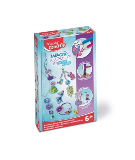 Crie acessórios modernos ao seu próprio estilo. Com Imagin'Style Magical Plastic, pode transformar os seus trabalhos artísticos em acessórios únicos e coloridos para si e para os seus amigos. ¶¶Uma atividade fácil para criar os seus próprios porta-chaves e acessórios. ¶Colora os desenhos fornecidos e depois encolha a obra de arte com um secador de cabelo ou no forno. ¶Quando aquecida, a coloração encolhe e torna-se sólida e brilhante! ¶Utilize a sua obra de arte para decorar os seus acessórios. ¶¶Uma atividade fácil para os entusiastas da moda a partir dos 6 anos.