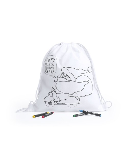 Saco / Mochila infantil de Natal em non-woven branco, especialmente desenhada para colorir com lápis de cera.¶Com fecho de cordões da mesma cor e reforços nos cantos.¶¶Inclui 4 lápis de cera de várias cores.¶25x30cm / 40grs