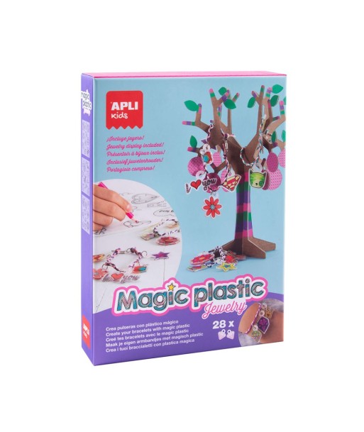 Kit para fazer Pulseiras e Missangas com Magic Plastic. ¶¶O objetivo do jogo é colorir e criar missangas para pendurar em pulseiras, colares, etc. ¶Crie os seus acessórios em 3 passos simples: pinte, corte e leve ao forno durante 1-2 minutos. ¶Uma atividade rápida e simples com resultados espetaculares.¶¶Excelente conteúdo de alta qualidade contém:¶3 folhas de plástico mágico com imagens pré-impressas e recortadas, barbante, anéis para pendurar os acessórios¶6 lápis de cor¶1 expositor em forma de árvore para as joias¶¶Um produto perfeito para desenvolver a criatividade e a imaginação, bem como a motricidade fina e a concentração.¶Recomendado para crianças com + 6 anos.¶Sempre use sob a supervisão de um adulto.