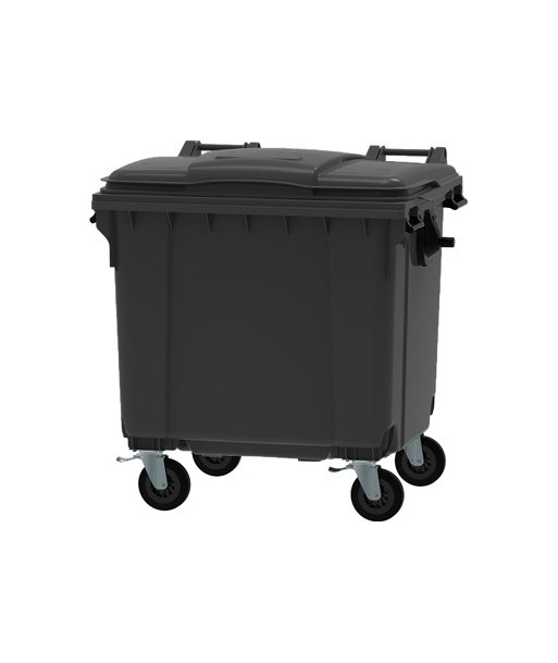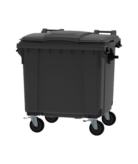 Contentor de carga traseira de 4 rodas (tampa plana), fabricado em polietileno injectado de alta densidade, com capacidade de 1100 litros¶¶Peso em vazio 50Kg¶Altura 1354mm¶Largura 1373mm¶Profunidade 1073mm¶Material Polietileno injectado de alta densidade (HPDE) estabilizado contra raios ultravioletas¶