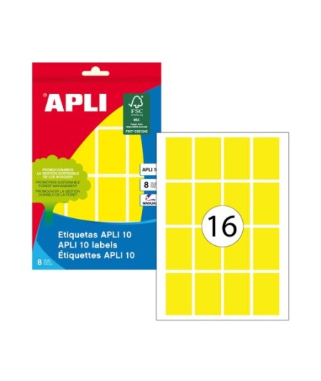 Etiquetas amarelas com cantos arrendondados em formato APLI 10, tamanho 25 x 40 mm com adesivo permanente. Embalagem com 8 folhas (128 etiquetas). ¶¶Etiquetagem rápida e eficaz sem a necessidade de passar pela impressora. ¶As etiquetas ideais para escrever com lápis, esferográfica (mesmo tinta gel) ou marcador, permitindo que a tinta seque rapidamente. ¶Adequado para caligrafia.¶¶Utilizações específicas:¶Etiquetas de arquivo¶Etiquetas para o comércio¶Etiquetas para casa¶Etiquetas de caligrafia¶Etiquetas de organização¶Etiquetas de produtos¶Etiquetas de realce ¶Etiquetas de sinalização¶¶Certificados: FSC