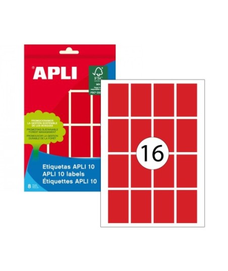 Etiquetas vermelhas em formato APLI 10, tamanho 25 x 40 mm com adesivo permanente. ¶Embalagem com 8 folhas (128 etiquetas). ¶¶Etiquetagem rápida e eficaz sem a necessidade de passar pela impressora. ¶As etiquetas ideais para escrever com lápis, esferográfica (mesmo tinta gel) ou marcador, permitindo que a tinta seque rapidamente. ¶Adequado para caligrafia.¶¶Certificados: FSC