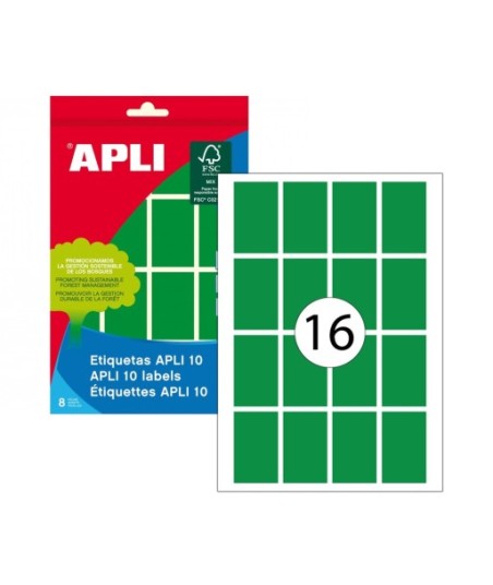Etiquetas verdes em formato APLI 10, tamanho 25 x 40 mm com adesivo permanente. ¶Embalagem com 8 folhas (128 etiquetas). ¶¶Etiquetagem rápida e eficaz sem a necessidade de passar pela impressora. ¶As etiquetas ideais para escrever com lápis, esferográfica (mesmo tinta gel) ou marcador, permitindo que a tinta seque rapidamente. ¶¶Utilizações específicas:¶Etiquetas de arquivo¶Etiquetas para o comércio¶Etiquetas para casa¶Etiquetas de caligrafia¶Etiquetas de organização¶Etiquetas de produtos¶Etiquetas de realce¶Etiquetas de sinalização¶¶Certificados: FSC