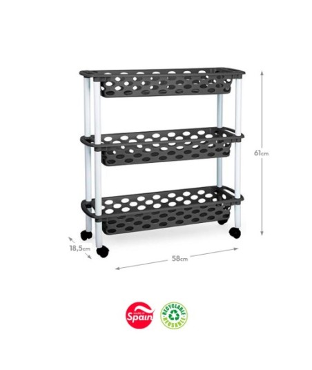Carrinho 3 Cestos Plástico 18,5x58x61cm Aire Slime Cinzento