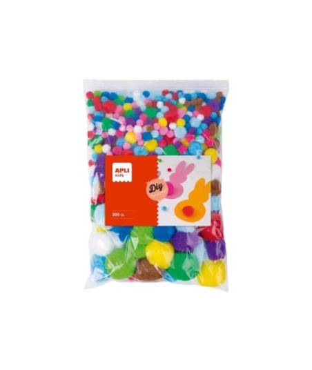 Pompons em cores variadas: amarelo, laranja, vermelho, fúcsia, lilás, rosa, azul céu, azul, azul escuro, verde, verde claro, marrom e branco. Cada embalagem contém 500 pompons em tamanhos variados: Ø 50 mm (15 unid.), Ø 40 mm (20 unid.), Ø 35 mm (15 unid.), Ø 25 mm (50 unid.), Ø 20 mm (100) pçs.), Ø 15 mm (100 pçs.) e Ø 10 mm (200 pçs.).¶Formato MAXI, ideal para escolas.¶Produto básico para escolas e oficinas infantis, ideal para criar guirlandas, decorações, colares, fantasias, aplicações em roupas ou uso em outros artesanatos. Ideal para estimular a imaginação e criatividade das crianças.