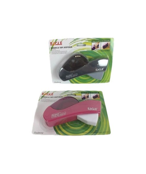 Em plástico. Comlâmina de corte para fácil utilização. Basta pressionar e a fita desliza e corta automaticamente.