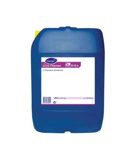Suma Chlorsan D10.4 20L - Detergente desinfetante¶Uso Profissional¶¶Suma Chlorsan D10.4 é um detergente desinfetante líquido, que limpa e desinfeta todas as superfícies num único passo. ¶A combinação de cloro, polímero e agentes tampão, torna este produto muito eficaz contra uma vasta gama de microrganismos, em águas de qualquer dureza. ¶A fórmula também contém alcalinos e tensoativos, que tornam este produto adequado para limpar e desinfetar num só passo.¶¶O produto pode ser utilizado para limpar e desinfetar num só passo¶Elimina sujidade de gordura e remove eficazmente as manchas¶Eficaz contra um largo espectro de microrganismos, ajudando a melhorar a higiene e a segurança¶Eficaz em águas de qualquer dureza¶¶Aspeto: líquido incolor, transparente¶pH (solução a 1% a 20 ° C): 11,5¶Densidade relativa (20 °C): 1,11¶Dimensões: 29 x 24 x 39.50cm¶¶Instruções de utilização:¶Pode ser utilizado o sistema doseador QFM da Diversey para preparar as soluções de forma controlada.