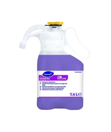 Suma Bac SD D10 1.4L - Detergente desinfetante - SmartDose¶Suma Bac D10 é um detergente desinfetante, altamente concentrado para a limpeza e desinfeção de todas as superfícies em áreas alimentares.¶¶Propriedades:¶Suma Bac D10 é uma combinação de Compostos de Amónio Quaternário, de um sequestrante e de um sistema tampão, que tornam este produto muito eficaz contra um amplo espectro de microrganismos, em águas de qualquer dureza. ¶A fórmula também contém tensoativos de modo a fornecer um excelente poder de limpeza.¶¶Benefícios:¶Limpeza e desinfeção num só produto¶Elimina sujidade de gordura e comida ressequida¶Eficaz contra um amplo espectro de microrganismos, ajudando a melhorar a higiene e a segurança¶Atividade bactericida, leveduricida e virucida¶Eficaz em águas de qualquer dureza¶Doseamento conveniente e controlado, através do sistema SmartDose¶Parte de uma oferta de 2 produtos SmartDose para todas as principais tarefas de limpeza diária de uma cozinha¶¶