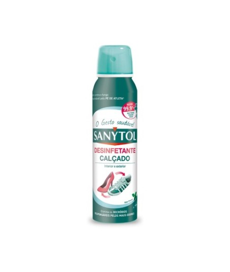 DESINFETANTE D CALÇADO - AROMA FRESCO. Bactérias, mofo e fungos no calçado são responsáveis pelos maus odores e podem transmitir doenças de pele e irritações.¶O desinfetante para calçado SANYTOL elimina os maus odores graças à sua fórmula única de absorção de odores. Desinfeta em profundidade e deixa uma agradável sensação de frescura.¶¶Elimina 99,9% de bactérias, fungos (origem de maus odores) e vírus¶Desinfeta e desodoriza todo o calçado da família¶Elimina os micróbios responsáveis por: micoses, verrugas, pé de atleta, etc¶Não mancha, não desbota, não engordura¶Sem lixívia¶Cheiro leve e fresco a desinfeção¶¶ADEQUADO PARA¶Sapatilhas¶Botas¶Sapato Salto Alto¶Chinelos¶Sabrinas¶¶FORMATO Aerossol 150ml¶FRAGRÂNCIAS Aroma Fresco¶¶CONSELHOS DE UTILIZAÇÃO¶1- Agite o aerossol antes de usar.¶2- Pulverizar dentro do calçado (sapatilhas, botas, sapatos salto alto, chinelos, etc.).¶3- Deixe atuar alguns minutos.¶4- Seque bem antes de usar.¶¶Repita a operação quantas vezes forem necessárias.