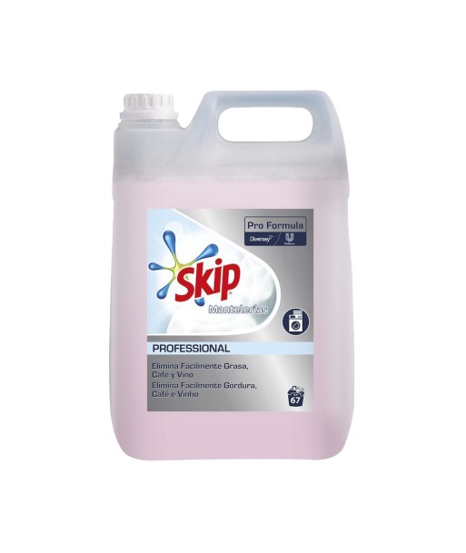 Excelente remoção de nódoas, ideal para restaurantes e hotéis! Skip e Comfort oferecem os produtos necessários à lavagem eficiente e ao bom estado de manutenção da sua roupa. Sempre olhando para as necessidades do seu negócio, proporcionamos-lhe produtos para a higiene geral ou necessidades específicas, para a remoção de nódoas difíceis ou desinfeção da sua roupa.¶¶Descrição¶Skip PF Mantelerías é especialmente formulado para proporcionar uma limpeza profunda, eliminando mesmo as nódoas mais resistentes, como gordura, café e vinho.¶Indicado para restaurantes e hotéis, Skip PF Mantelerías, com a sua fragrância característica, permite-lhe obter uma limpeza profissional e um aroma fresco e leve.¶Skip PF Mantelerias é seguro em todos os tipos de algodão e tecidos delicados, proporcionando uma excelente limpeza em tecidos brancos e coloridos.¶¶Benefícios¶Excelente remoção de nódoas de gordura, café e vinho¶Fragrância agradável e duradoura¶Seguro em tecidos brancos, coloridos e delicados¶Ótimos resultados mesmo a baixas temperaturas (30 °C)¶¶Pro Formula¶Um ambiente perfeitamente limpo está na base de qualquer experiência e relacionamento duradouro com o cliente.¶Pro Formula coloca à sua disposição uma gama completa de produtos de limpeza com fórmulas profissionais e marcas de confiança da Unilever, como Skip, Cif, Sun, Sunlight e Domestos.¶Esta gama foi desenvolvida especificamente para ir ao encontro das necessidades dos seus negócios, proporcionando-lhe os resultados excecionais de uma limpeza profissional.¶¶Instruções de utilização¶Colocar diretamente na gaveta ou no tambor da máquina de lavar¶Adicionar a roupa¶Para melhores resultados, usar 75 ml para cargas normais (4 - 5 kg), a temperaturas entre os 30 °C e o 60 °C¶Armazenar entre 5 °C e 25 °C¶¶Aspeto: Líquido, rosa claro, opaco¶Odor: Ligeiramente perfumado¶Embalagem: 5L (67 doses)