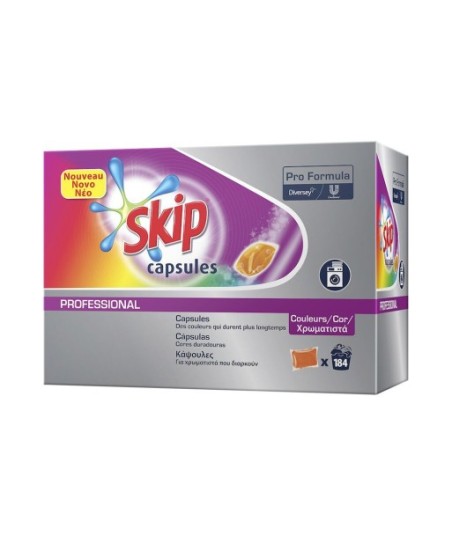 Skip cápsulas é fácil de usar e oferece resultados de uma limpeza profissional oferecendo, não só, o poder de lavagem, como um fantástico perfume e a proteção da fixação das cores dos seus tecidos.¶Cada unidade contem 184 cápsulas em 4 embalagens de 46 unidades cada.¶¶Resultados de lavagem superiores¶Perfume de longa duração¶Proteção das cores¶¶Um ambiente perfeitamente limpo está na base de qualquer experiência e relacionamento duradouro com o cliente. Pro Formula coloca à sua disposição uma gama completa de produtos de limpeza com fórmulas profissionais e marcas de confiança da Unilever, como Skip, Cif, Sun, Sunlight e Domestos. Esta gama foi desenvolvida especificamente para ir ao encontro das necessidades dos seus negócios, proporcionando-lhe os resultados excecionais de uma limpeza profissional.¶¶Aplicação:¶Indicado para a limpeza da roupa em em unidades hoteleiras e restauração e sempre que as exigências de limpeza e manutenção da cor sejam elevadas.Instruções de utilizaçãoUtilize uma cápsula em sujidade regular, águas médias e máquinas de 3-5Kg. Utilize duas cápsula em sujidade forte, águas duras ou máquinas de 6-8Kg.¶¶Aspeto: Cor da cápsula - liquido laranja opaco¶Embalagem: 3,86 kg (184 cápsulas)