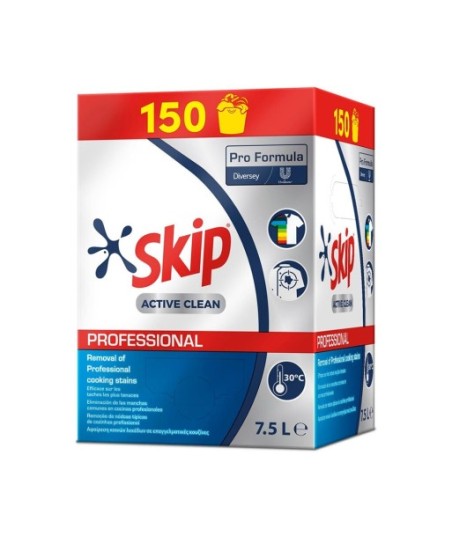 Skip Pro Formula Active Clean com bola doseadora 1x7.5L ¶Detergente líquido de alto desempenho para lavar todos os tipos de roupa.¶¶Indicado para roupa branca ou colorida, Skip Pro Formula Active Clean elimina nódoas difíceis à primeira lavagem.¶Dermatologicamente testado e com agentes branqueadores.¶A bola doseadora fornecida em cada embalagem permite um fácil doseamento numa embalagem ergonómica e amiga do ambiente.¶¶BENEFÍCIOS¶Doseamento fácil e preciso evitando sobredosagens, através da torneira integrada e da bola doseadora fornecida em cada embalagem¶Resultados excelentes de lavagem mesmo a baixas temperaturas e ciclos curtos¶Dermatologicamente testado e indicado para peles sensíveis¶¶INSTRUÇÕES DE UTILIZAÇÃO¶Não sobrecarregue a máquina de lavar roupa.¶Verificar sempre a etiqueta de conservação do artigo e seguir as instruções de lavagem.¶Não lave tecidos resistentes a chamas em água quente, ou seja, acima de 50°C.¶Separe previamente a sua roupa em brancos, claros e coloridos.¶Para lãs e sedas laváveis na máquina, recomendamos a utilização de um produto específico.¶Verificar sempre a solidez da cor antes de pré-tratar as nódoas com um líquido puro.¶Não molhar tecidos não resistentes à cor, tecidos resistentes à chama, couro ou peças de vestuário com fechos de metal. Não utilizar em seda e lã.¶Seguir as recomendações de dosagem presentes na embalagem