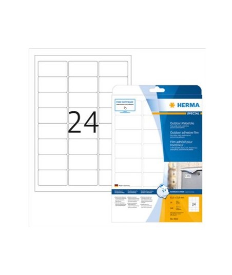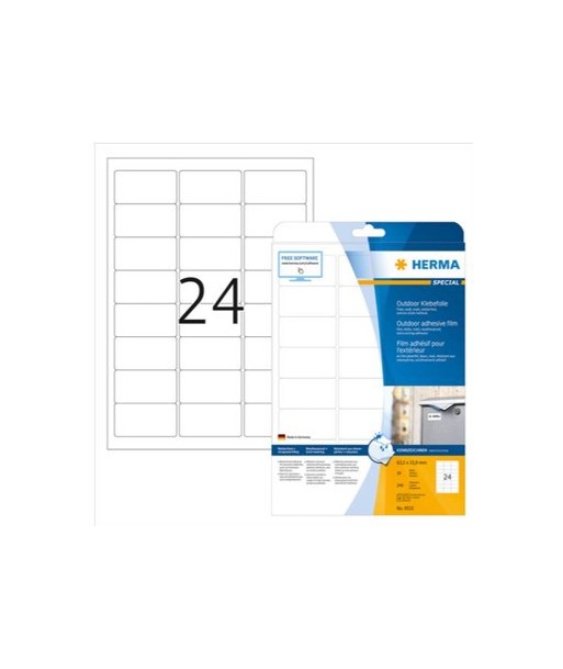 Etiquetas resistentes às intempéries em película de polietileno branco mate, autocolante. ¶Ideal para aplicações no exterior e exposição a condições adversas: etiquetas de identificação, sinais adesivos para montras, sinais de informação e aviso, identificação de artigos em armazéns e instalações de produção. ¶Forte aderência, mesmo em superfícies críticas.¶¶Adesão fiável em condições extremas, resistente a temperaturas de -40° C a +150° C¶Ideal para aplicações robustas, resistente ao envelhecimento e à água salgada¶Adequado para impressoras laser e fotocopiadoras, resultados de impressão perfeitos a preto e branco e a cores, não para impressoras de jato de tinta¶¶Formato: 63,5 x 33,9 mm¶Cantos redondos¶Adesivo Extra Forte¶240 etiquetas - 10 folhas¶Cor: Branco ¶Impressão: Laser / Copy¶