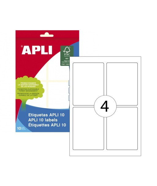 Etiquetas brancas com pontas redondas no formato APLI 10, tamanho 50,0 x 70,0 mm com adesivo permanente. ¶Embalagem com 10 folhas (40 etiquetas). ¶¶Etiquetagem rápida e eficaz sem a necessidade de passar pela impressora. ¶As etiquetas ideais para escrever com lápis, esferográfica (mesmo tinta gel) ou marcador, permitindo que a tinta seque rapidamente. ¶Adequado para caligrafia.