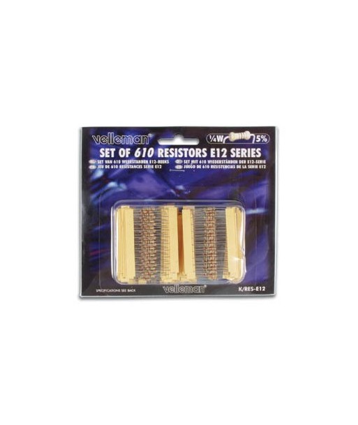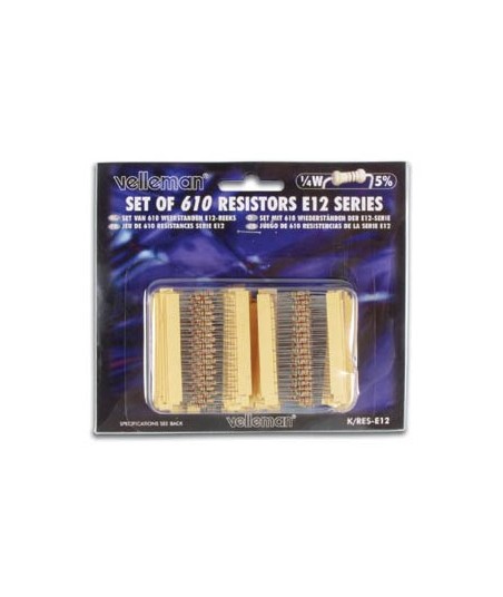 Resistências de alta qualidade de filme de carbono com um fio de conexão que permite uma fácil soldadura.¶¶Aplicações: TV, áudio e vídeo, equipamentos, receptores de telefone e sistemas de comunicação, instrumentação, eletrodomésticos, ...¶¶Quantidade: 610 peças (10 peças por valor)¶Série: E12¶Número de valores: 61 (a partir de 10E a 1M)¶Potência: 1/4W¶Faixa de temperatura operacional: -55 °C a + 155 °C¶Tolerância: 5%¶Max. tensão de operação: 250V¶Faixa de temperatura operacional: -55 °C a 155 °C¶Tolerância: 5%¶Max. tensão de operação: 250V¶¶Tipo de embalagem: Blister cartão¶
