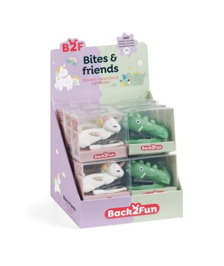 Expositor com Agrafadores da Coleção Bites and Friends !! Ideal para Pontos de Venda !!¶¶Mini agrafadores infantis de borracha macia com 400 agrafos incluídos Nº10.¶Design divertido e compacto, presente escolar original, papelaria bonita para meninos, meninas e uso diário na escola.¶¶Com o seu tamanho compacto 70 x 45 x 25 mm e design ergonómico, este agrafador encaixa perfeitamente em mãos pequenas.¶Ideal para a volta às aulas ou para ter na secretária infantil.¶¶Criado com formas de adoráveis animais, transforma qualquer tarefa escolar numa experiência divertida.¶Uma mini ferramenta que combina funcionalidade com muita ternura.¶¶Perfeito para usar em casa, na escola ou em trabalhos manuais.¶É resistente e fácil de usar, ideal para acompanhar os mais pequenos no dia a dia ou como um presente encantador.¶¶Cada unidade inclui uma recarga de 400 agrafes Nº10 numa caixa de cartão, pronto a usar desde o primeiro momento.¶Praticidade e encanto num único produto.¶¶Com a sua textura de borracha e design de dinossauro / unicórnio, este modelo verde traz um toque selvagem e simpático à secretária de qualquer criança.¶Perfeito para pequenos exploradores cheios de imaginação!¶¶Expositor 160 x 250 x 150 mm¶Conteúdo: Inclui 12 unidades, 6 de cada modelo¶¶Agrafador: 70 x 45 x 25 mm¶Caixa PVC: 76 x 66 x 35 mm¶Material dos agrafadores: Silicone¶¶¶¶