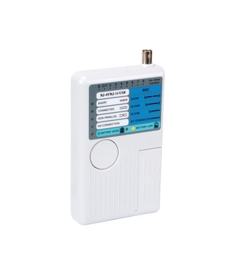 Este testador de redes (LAN e USB) testa vários tipos de cabos. É indispensável nas atividades de instalação e manutenção de redes. Este dispositivo compacto pode ser usado para testes de rede ou cabos de telefone (USB-A, USB-B, BNC, 8P8C (RJ45), 6P6C (RJ12), 6P2C (RJ11), 4P4C (RJ10) USB) e e para a maioria dos tipos de cabos de computador.¶¶Características¶Indicação de LED¶Design avançado ¶Capacidade para testar cabos de grande comprimento e em lugares que não são facilmente acessíveis¶Executa automaticamente todos os testes e verificações de continuidade, aberto, curto-circuito e pares de fios cruzados¶¶Especificações¶Testador de redes 5-em-1: USB, RJ-45, 10Base-T, Token Ring, cabos RJ11/12¶Fonte de alimentação: Pilhas 9V 6LR61C bateria (não incl.)¶Comprimento máximo do cabo para o teste: 200 m¶¶
