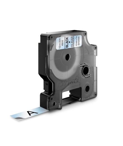 Material da fita: Vinil¶Adesivo: Permanente¶Cor de fundo: Transparente¶Cor do texto: Preto¶Largura: 12 mm¶Comprimento: 7 m¶¶Compatível com rotuladoras:¶LabelManager: 100, 100PLUS, 120P, 150, 160, 200, 210D, 220P, 260P, 280, 300, 350, 350D, 360D, 400, 420P, 450, 450D, 500TS, PC, PC 2, PnP, Wireless PnP¶LabelPoint: 100, 150, 200, 250, 300, 350¶LabelWriter Duo: 400 Duo, 450 Duo¶MobileLabeler