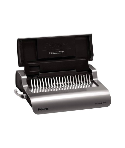 Punção elétrica para perfuração sem esforço de até 25 folhas¶Capacidade de perfuração de 25 folhas¶Capacidade de encadernação de 500 folhas com tamanho máximo de pente de 50 mm¶Pente inclinado para facilitar o carregamento de chapas perfuradas¶Guia de borda ajustável alinha a folha com precisão¶Bandeja de armazenamento com medida patenteada de pente e documento para seleção rápida dos suprimentos de tamanho correto¶Inclui kit inicial para encadernar 10 documentos¶Material: Aço