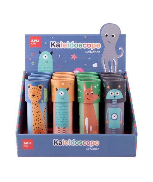 Um caleidoscópio é um instrumento óptico que consiste num tubo com dois ou três espelhos e cristais coloridos em seu interior, dispostos de tal forma que se você mover o tubo e olhar dentro dele, poderá ver diferentes figuras geométricas simétricas. ¶Gire o tubo e experimente um show de luzes vibrante! Ideal para estimular a curiosidade dos mais pequenos. ¶¶Expositor caleidoscópio sortido com 4 designs diferentes:¶Robôs, Animais Selvagens, Monstros Engraçados e Animais de Estimação Felizes.¶Cada caleidoscópio mede 169 x Ø 55 mm.¶Ao girar o caleidoscópio, pode trocar as partes do corpo dos personagens e formar diferentes combinações de animais, robôs ou monstros.¶¶Cada expositor contém 12 caleidoscópios, 3 por design:¶3x Caleidoscópio Robôs¶3x Caleidoscópio Animais Selvagens¶3x Caleidoscópio Monstros Engraçados¶3x Caleidoscópio Animais de Estimação Felizes¶¶Expositor 275x210x180mm ¶¶Idade Recomendada: +3 anos ¶¶