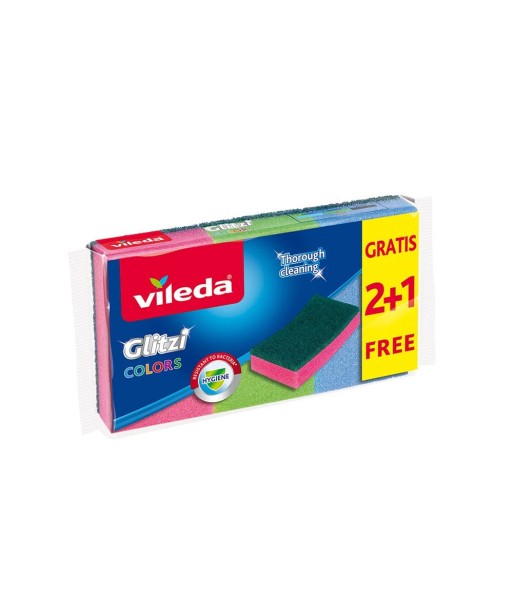 O novo Esfregão Esponja Glitzi Colors 2+1 unidade grátis, é um esfregão com tratamento anti bactérias na fibra. ¶Este tratamento permite atrasar o desenvolvimento de bactérias e maus odores no esfregão.¶¶O Esfregão Esponja Glitzi Colors é o teu aliado para as limpezas diárias, eliminando eficazmente a sujidade de todo o tipo de superfícies.¶A esponja hidrófila proporciona uma absorção de líquidos mais eficaz do que as esponjas tradicionais. ¶¶Inclui três cores diferentes que permitem limpar superfícies distintas ou dar diferentes funcionalidades.