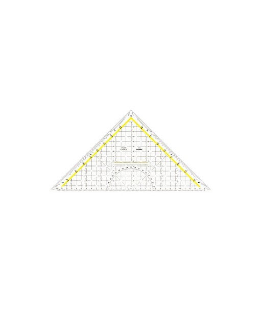 Com pega fixa¶Grelha de 10 mm, inclinações milimétricas perpendiculares à hipotenusa¶Hipotenusa 325mm¶Graduação muito fina e exacta, gravada de forma a resistir ao desgaste¶Ângulos marcados em 7° e 42° para desenho em perspectiva, 75° para letra itálica e linhas de 45° para facilitar a eclosão¶Feito de plexiglas® altamente transparentes ¶Faceta de escala milimétrica¶Relevo profundo e o nível de resistência à abrasão, pela dureza do material, letras e escala de ângulo amarelo.¶Está em conformidade com as normas ÖNORM A2134 e A21¶Embalagens de papelão certificadas pelo FS¶Numeração em sentido contrário com fundo amarelo¶Marcações coloridas para traçar paralelas e verticais¶Grelha interior com graduações de 10mm¶Arestas biseladas¶Cantos reforçados¶