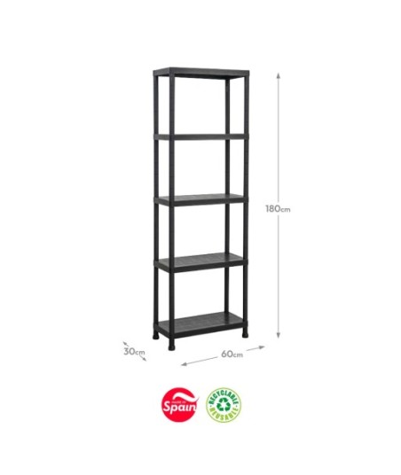 Estante modular com 5 prateleiras para armazenamento doméstico.¶Peso máximo suportado por prateleira 25 kg.¶A prateleira deve ser fixada na parede e entre prateleiras com os dispositivos de fixação fornecidos para evitar acidentes.¶Posicione a prateleira sobre uma superfície plana.¶Siga as instruções de montagem e os avisos de segurança (ferramentas e acessórios não incluídos).¶Requisitos de segurança, resistência e estabilidade verificados de acordo com a norma UNE-EN 14749:2016 vc 2017.¶¶Medidas: 30 x 60 x 180 cm ¶Cor: Preto¶Peso 4,738