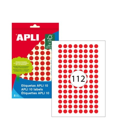 Etiquetas circulares vermelhas em formato APLI 10, tamanho Ø 10 mm com adesivo permanente. Embalagem com 8 folhas (1.008 etiquetas).¶¶Etiquetagem rápida e eficaz sem a necessidade de passar pela impressora. ¶As etiquetas ideais para escrever com lápis, esferográfica (mesmo tinta gel) ou marcador, permitindo que a tinta seque rapidamente. ¶Adequado para caligrafia.¶¶Certificados: FSC