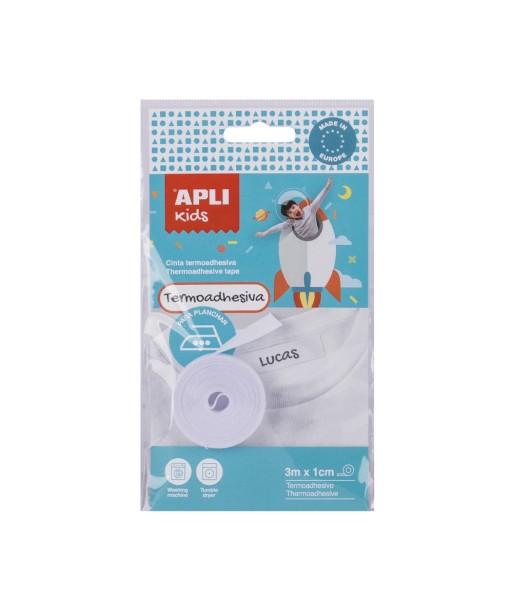 Fita adesiva térmica branca, ideal para marcar roupas, mochilas, batas ou qualquer outro tipo de tecido de forma fácil e rápida. ¶Fita resistente e de alta qualidade: 70% poliéster e 30% algodão. Resiste à máquina de lavar e secar roupa.¶¶Como usar:¶escreva na fita com uma esferográfica comum, corte a etiqueta e passe o ferro na roupa por 20 segundos.¶¶Cada saco contém:¶1x fita de 10 mm (largura) x 3 metros (comprimento). ¶¶