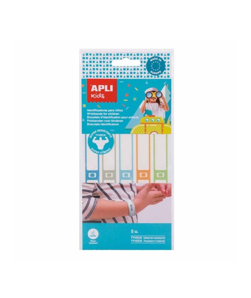Pulseiras confeccionadas em papel de seda macio e muito resistente, que oferece maior resistência a puxões, arranhões e até água, e é bem macio para não agredir a pele das crianças. Estas pulseiras são ideais para evitar que as crianças se percam quando vão em grupo a lugares lotados: excursões, acampamentos, festas, concertos, espetáculos, etc.¶Ideal para escrever o nome, endereço ou um número de telefone.¶¶Como usar: ¶Escreva à mão ou imprima, separe a pulseira das demais, coloque no pulso, retire a parte adesiva e encaixe para fechar.¶¶Cada pacote contém 5 pulseiras¶Pulseiras de identificação tamanho 205 x 19 mm¶¶