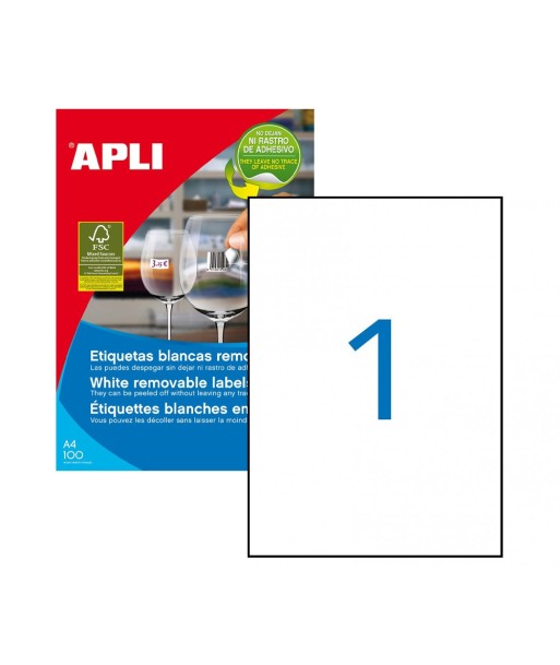Etiquetas brancas com pontas retas, tamanho 210,0 x 297,0 mm com adesivo removível para usos múltiplos. ¶Embalagem com 100 folhas (100 etiquetas). ¶¶O adesivo removível permite que a etiqueta seja removida sem deixar vestígios. ¶Perfeito para identificar objetos, precificar produtos, colar em vidro ou cerâmica, etc. ¶Excelente qualidade de impressão em impressoras jato de tinta, laser ou fotocopiadora.¶Etiquetas pré-recortadas.¶¶Certificados: FSC