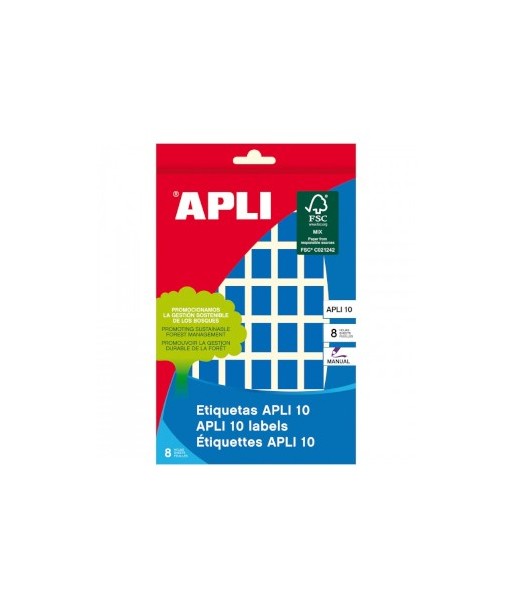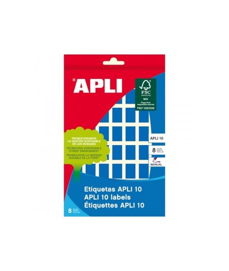 Etiquetas azuis em formato APLI 10, tamanho 12 x 18 mm com adesivo permanente. ¶Embalagem com 8 folhas (448 etiquetas). ¶¶Etiquetagem rápida e eficaz sem a necessidade de passar pela impressora. ¶As etiquetas ideais para escrever com lápis, esferográfica (mesmo tinta gel) ou marcador, permitindo que a tinta seque rapidamente. ¶Adequado para caligrafia.