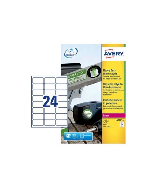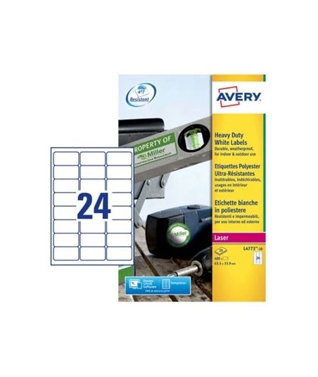 Para marcação permanente de produtos usados em ambientes internos e externos, escolha as etiquetas resistentes da Avery.¶Estas etiquetas brancas a laser são significativamente mais duráveis do que as etiquetas de papel convencionais devido à sua forte adesão e resistência à água, óleo, sujeira, raios UV e temperaturas extremas (-20°C a + 80°C). ¶Ideal para aplicação em metal, plástico, superfície pintada, tecido, policarbonato e vidro, tanto em ambientes internos quanto externos.¶Adequado para impressão na maioria das impressoras a laser, o excelente acabamento de impressão nestas etiquetas brancas brilhantes é claro e nítido em cores ou preto e branco. ¶¶Dimensões: 63,5 x 33,9 mm¶Conteúdo: 480 etiquetas / 20 folhas¶Tipo de impressora: Laser¶Código de software: L4773¶Tipo de adesivo: Permanente¶Cor: branco¶Material: Poliéster¶Tipo de revestimento: fílmico¶Formato: A4