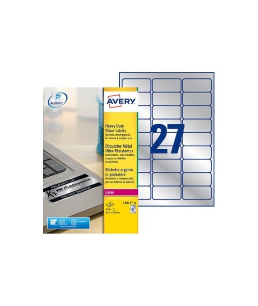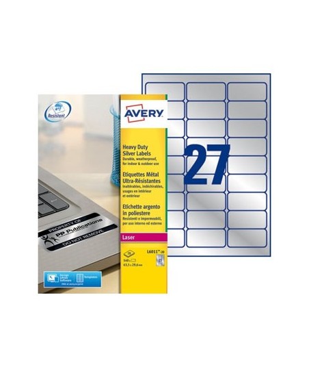 As etiquetas prateadas com formato 63,5x29,6mm foram especialmente desenvolvidas para a rotulagem confiável e profissional de bens imobilizados. ¶¶540 etiquetas de filme com revestimento fosco em 20 folhas por pacote. ¶As etiquetas de filme de poliéster reforçado são resistentes a óleo, sujeira, UV e temperatura (-40°C a +150°C) e à prova de água e rasgos. ¶As etiquetas prateadas são perfeitas para a propriedade da empresa de rotulagem, como dispositivos e componentes eletrónicos.                                                                                                                                                                                                                                                              ¶Dimensões: 63,5 x 29,6 mm¶Conteúdo: 540 etiquetas / 20 páginas¶Tipo de impressora: Laser P/B¶Código de software: L6011¶Tipo de adesivo: permanente¶Cor: Prata¶Superfície (característica especial): Mate¶Material: Poliéster¶Propriedades do material: À prova de intempéries, resistente à temperatura, resistente à água, repelente de água/sujeira, resistente¶Adequado para: Rotulagem de inventário, identificação de propriedade, interior, exterior, etiquetas prateadas para serviço pesado, rotulagem de armazém, rotulagem de prateleira¶Forma : Retangular com cantos arredondados¶Formato: A4¶Sem PVC¶