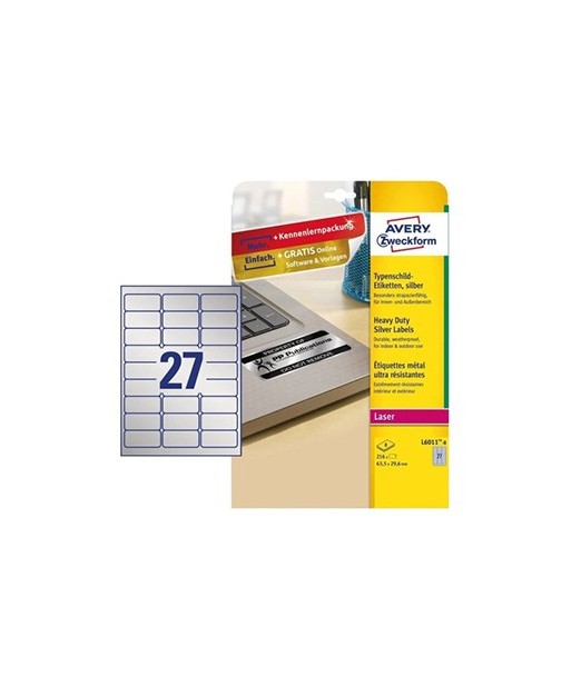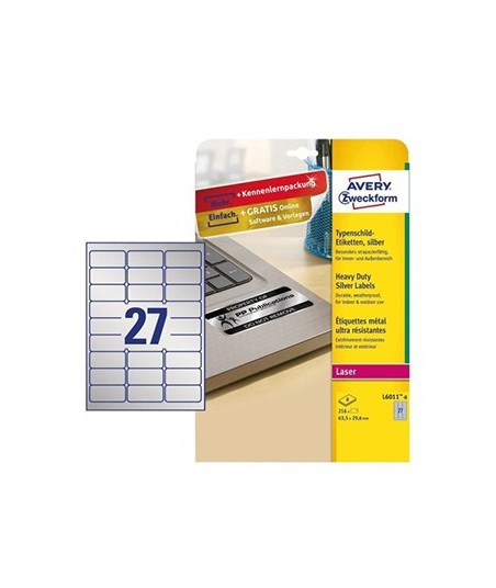 Etiquetas prateadas para uso industrial¶¶Adequado para: Rotulagem de inventário, identificação de propriedade, interior, exterior, rotulagem de armazém, rotulagem de prateleira¶Revestimento resistente, prateado e mate¶Resistente a óleo, sujidade, UV e temperatura¶À prova d'água¶¶Dimensões: 63,5 x 29,6 mm¶Conteúdo: 216 Etiquetas / 8 Folhas¶Tipo de impressora: Laser P/B¶Tipo de adesivo: Permanente¶Feito de: Poliéster¶Forma: Retangular com cantos arredondados