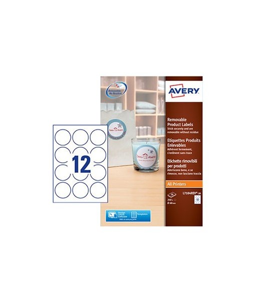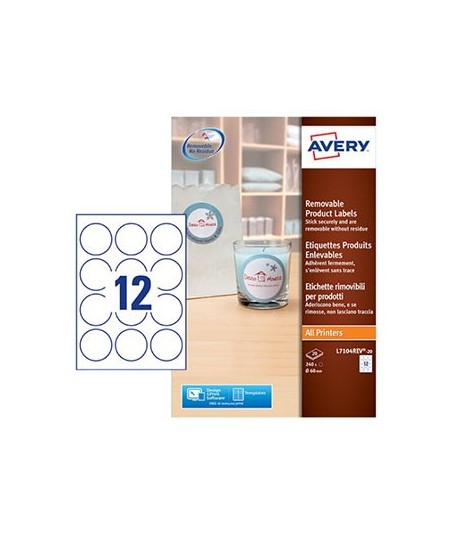 Quer um acabamento verdadeiramente profissional para os seus produtos? ¶Com estas etiquetas Avery redondas removíveis, pode facilmente criar sua imagem de marca e aplicá-la aos seus produtos. ¶Para uma renderização verdadeiramente profissional de sua embalagem, estas etiquetas podem ser impressas com bordas sangradas. ¶¶Aderem perfeitamente a todo o tipo de superfícies e podem ser removidas sem deixar vestígios. ¶Use-as para a embalagem dos seus produtos. ¶¶Dimensões: Ø 60mm¶Conteúdo: 240 etiquetas / 20 folhas¶Impressão: Todos os tipos de impressora¶Código de software: L7104¶Tipo de adesivo: Adesivo removível¶Cor: Branco¶Material: Papel¶Formato: A4¶Certificado FSC