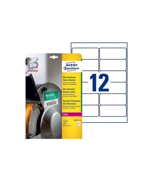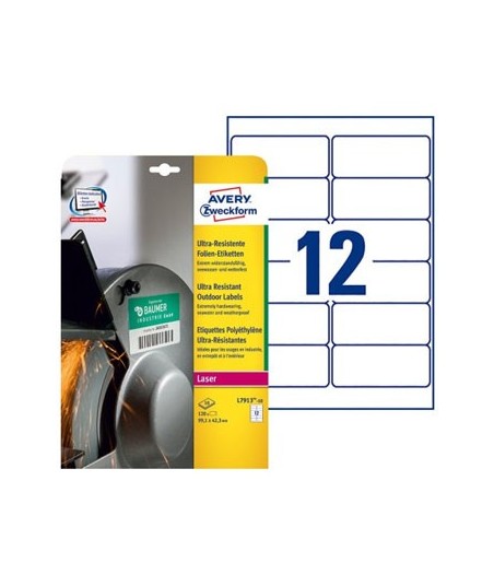 Etiquetas Externas Ultra Resistentes extremamente duráveis para as aplicações mais difíceis.¶Adesão extra forte mesmo em superfícies difíceis, material PE elástico¶Resistente a óleo, sujeira e temperatura (-40°C a +150°C), lavável¶Etiquetas resistentes à água do mar e UV, não envelhecidas e à prova de intempéries¶Resistente a muitos solventes e agentes de limpeza¶¶Dimensões: 99,1 x 42,3 mm¶Conteúdo: 120 etiquetas / 10 páginas¶Tipo de impressora: Laser ¶Código de software: L7913¶Tipo de adesivo: Permanente¶Cor: Branco¶Superfície (característica especial): Mate¶Material: Polietileno (PE)¶Adequado para: Rotulagem de inventário, identificação de propriedade, interior, exterior, rotulagem de contentores¶Forma: Retangular com cantos arredondados¶Sem PVC
