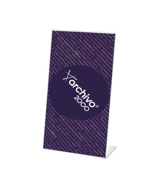 Expositor de secretária em forma de L Arquivo 2000 1/3 A4 vertical.¶¶Fabricado em poliestireno ultra-transparente de alta qualidade e resistência.¶Visibilidade de um lado.¶O documento desliza lateralmente.¶Base larga que o torna muito estável.¶¶Medidas exteriores: 60x100x210 mm.