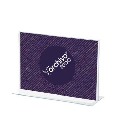 Expositor de secretária em forma de T Arquivo 2000 A4 horizontal.¶¶Fabricado em poliestireno ultra-transparente de alta qualidade e resistência.¶Visibilidade dos dois lados.¶O documento pode ser inserido a partir de baixo ou de ambos os lados.¶Base larga que o torna muito estável.¶¶Medidas exteriores: 85x300x215 mm.