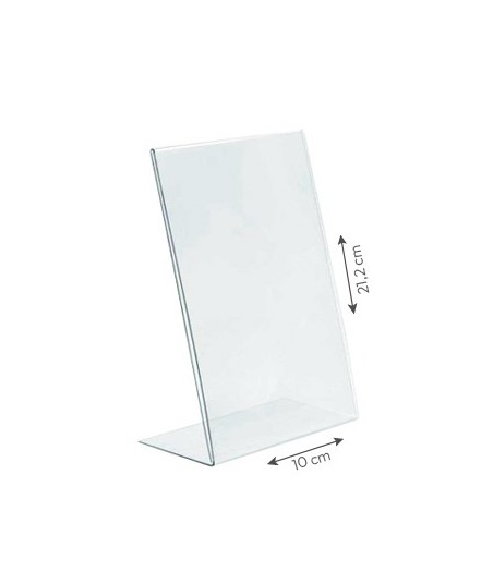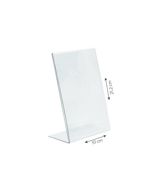 Ideal para comunicar campanhas, promoções entre outros, base formato em L.¶Inclinado para melhor visibilidade. ¶Conteúdo rapidamente trocado através da abertura lateral. ¶Base grande e estável.¶¶Medidas:¶Largura 10cm¶Altura 21,2cm¶¶Formato A4¶Tipologia Vertical¶Material Poliestireno¶Cor Transparente¶¶¶