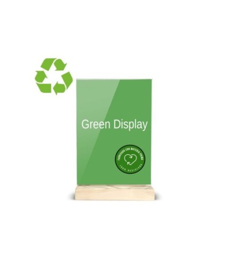 Green Display de mesa sustentável com base de madeira.¶Formato vertical A5.¶Fabricado em metacrilato 100% reciclado e reciclável, ultra transparente e resistente.¶Base de madeira com acabamento lixado e canal passante, ranhura anti-queda adaptada a cada formato para maior segurança dos documentos.¶¶Tamanho da madeira 40x150x30 mm.¶Medidas exteriores: 40x150x240 mm.¶Made in spain