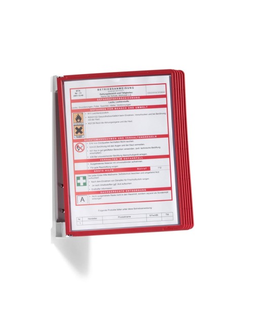 Conjunto completo de painéis de visualização para aplicações de parede.¶Suporte de parede com 5 painéis SHERPA® em formato A4.¶¶Ecrãs de polipropileno com moldura de perfil colorido e película de baixo reflexo adequada para scanners.¶¶Montagem simples na parede.¶Mecanismo pivotante prático para uma substituição simples dos ecrãs.¶¶Para formato A4¶Cor: Vermelho¶Dimensões externas: 360 x 325 x 260 mm¶¶Ângulo de leitura ajustável: Não¶Extensível: Não¶Pode ser digitalizado: Sim ¶Antirreflexo: Sim¶¶5 anos de garantia.