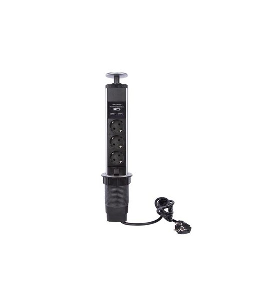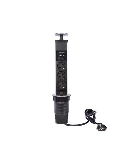 TOMADA TRIPLA POP-UP PARA TER ELETRICIDADE EM TODO O LADO¶¶PROPRIEDADES FÍSICAS¶Comprimento do Cabo: 1,4 m¶ ¶DADOS RELATIVOS À ELETRICIDADE¶Classificação da Corrente Máxima: 16 A¶Classificação de Potência Máxima: 3680 W¶Proteção do Fusível: Não¶Protecção Contra Sobrecarga: Não ¶Proteção Contra Surtos: Não ¶ ¶DADOS TÉCNICOS¶Tipo de Cabo: H05VV-F 3G1.5¶ ¶DADOS AMBIENTAIS¶Classificação IP: IP20¶Espessura Máxima da Mesa: 65 mm¶Profundidade de Folga Mínima: 450 mm¶Altura Pop-up: 282 mm¶Casa Inteligente: Não¶ ¶PROPRIEDADES DE FUNCIONAMENTO¶Diâmetro do Furo de Montagem: 71 mm¶ ¶LIGAÇÕES ELÉTRICAS¶Número de Tomadas: 3¶Tipo de Ficha Principal: Alemanha (Schuko)¶Tipo de Tomada: Alemanha (Schuko)¶ ¶LIGAÇÕES IT¶USB: Sim ¶Tipo de Porta USB: USB-A¶ ¶FONTE DE ALIMENTAÇÃO¶Classificação de tensão VAC: 250 V AC¶Classificação da Frequência de Entrada: 50 Hz¶Corrente de Saída USB: 2,1 A¶ ¶INCLUI¶Luz Indicadora ¶Montagem de Acessórios: Sim ¶Número de Portas USB: 2¶ ¶INFORMAÇÃO BÁSICA SOBRE O PRODUTO¶Cor: Cinzento¶Cor Adicional: Preto¶Altura: 43 cm¶Profundidade: 8 cm¶Largura: 8 cm¶Peso: 740 g¶Material: Alumínio¶Material Adicional PVC (Cloreto de Polivinila)