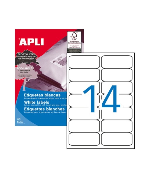 Etiquetas brancas com cantos arrendondados, tamanho 99,1 x 38,1 mm com adesivo permanente para usos múltiplos. ¶Embalagem com 100 folhas (1.400 etiquetas). ¶¶Perfeito para identificar remessas de correspondência, objetos, encomendas ou para classificar. ¶Excelente qualidade de impressão em impressoras jato de tinta, laser ou fotocopiadora. ¶¶Utilizações específicas:¶Etiquetas imprimíveis¶Etiquetas para embalagens¶Etiquetas para envelopes¶¶Certificado: FSC
