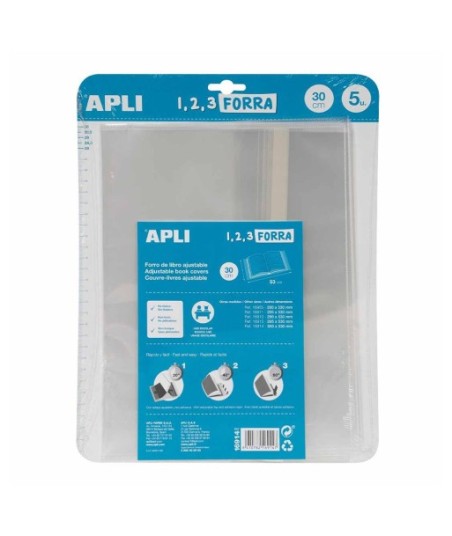 A maneira mais fácil de proteger os livros, cadernos e pastas, pois adapta-se à largura sem precisar cortar ou usar fita adesiva.¶¶Siga em apenas 3 passos:¶1. Insira as capas do livro nas abas¶2. Ajuste a capa fechando o livro¶3. Retire a fita e cole-a¶Em conformidade com a regulamentação REACH e com adesivo à base de água e ecológico.¶¶Tamanho 300x530mm ¶5 capas plásticas¶Plástico de alta resistência com 75 microns¶Cor transparente¶Não adesivo¶Com aba ajustável¶Qualidade Apli¶