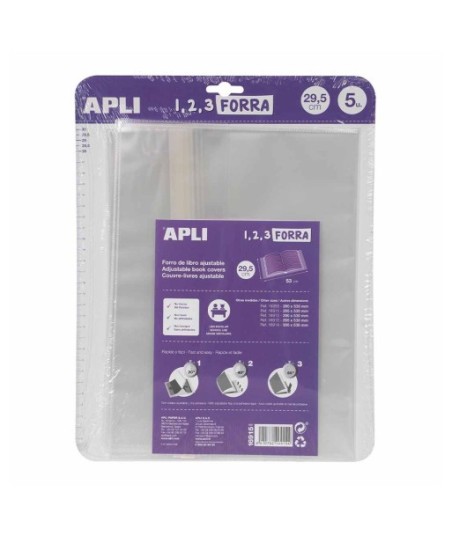 A maneira mais fácil de proteger os livros, cadernos e pastas, pois adapta-se à largura sem precisar cortar ou usar fita adesiva.¶¶Siga em apenas 3 passos:¶1. Insira as capas do livro nas abas¶2. Ajuste a capa fechando o livro¶3. Retire a fita e cole-a¶Em conformidade com a regulamentação REACH e com adesivo à base de água e ecológico.¶¶Tamanho 295x530mm ¶5 capas plásticas¶Plástico de alta resistência com 75 microns¶Cor transparente¶Não adesivo¶Com aba ajustável¶Qualidade Apli¶