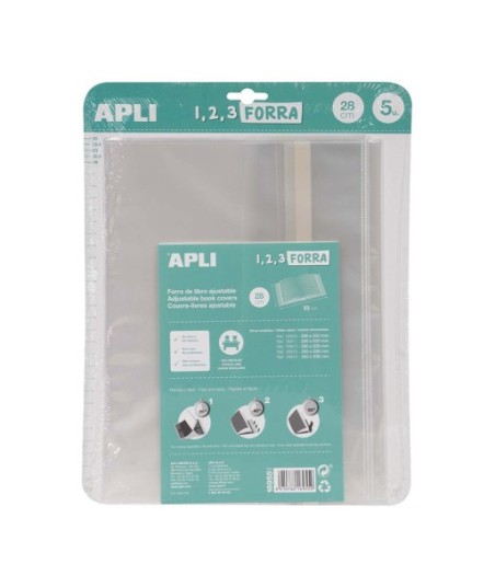 A maneira mais fácil de proteger os livros, cadernos e pastas, pois adapta-se à largura sem precisar cortar ou usar fita adesiva.¶¶Siga em apenas 3 passos:¶1. Insira as capas do livro nas abas¶2. Ajuste a capa fechando o livro¶3. Retire a fita e cole-a¶Em conformidade com a regulamentação REACH e com adesivo à base de água e ecológico.¶¶Tamanho 280x530mm ¶5 capas plásticas¶Plástico de alta resistência com 75 microns¶Cor transparente¶Não adesivo¶Com aba ajustável¶Qualidade Apli¶